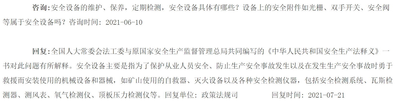 这一条规定向我们传达了两个信息,明确规定了安全设备需要定期的维护,第二明确规定了安全设备的检测应当符合标准或行业标准。可能较真的网友会问,气体检测报警仪属不属于安全设备呢?这个问题确实很普遍,那么我们必须把安全设备的范围讲清楚,一部法律的出台,并不能够解决所有的细节问题,这个时候就需要对法律进行释义,新《安全生产法》颁布了,目前还没公布条文释义,但我们可以参考2014版《安全生产法》条文释义,在2014版《中华人民共和国安全生产法释义》中对安全设备做了以下解释:“安全设备主要是指为了保护从业人员安全、防止生产安全事故发生以及在发生生产安全事故时勇于救援而安装使用的机械设备和器械,如矿山使用的自救器、灭火设备以及各种安全检测仪器,包括安全检测系统、瓦斯检测器、测风表、氧气检测仪、顶板压力检测仪等。"
